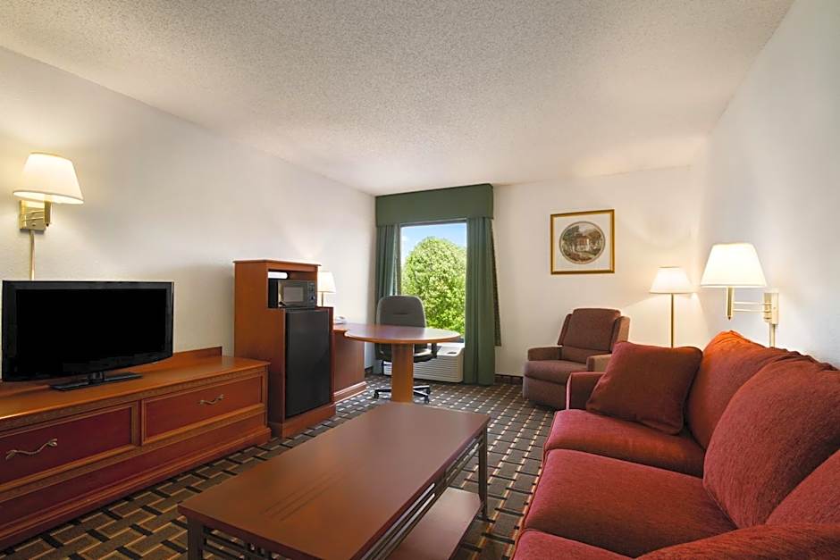 A microwave, flat-screen cable TV, and seating area with a sofa are featured in this suite.